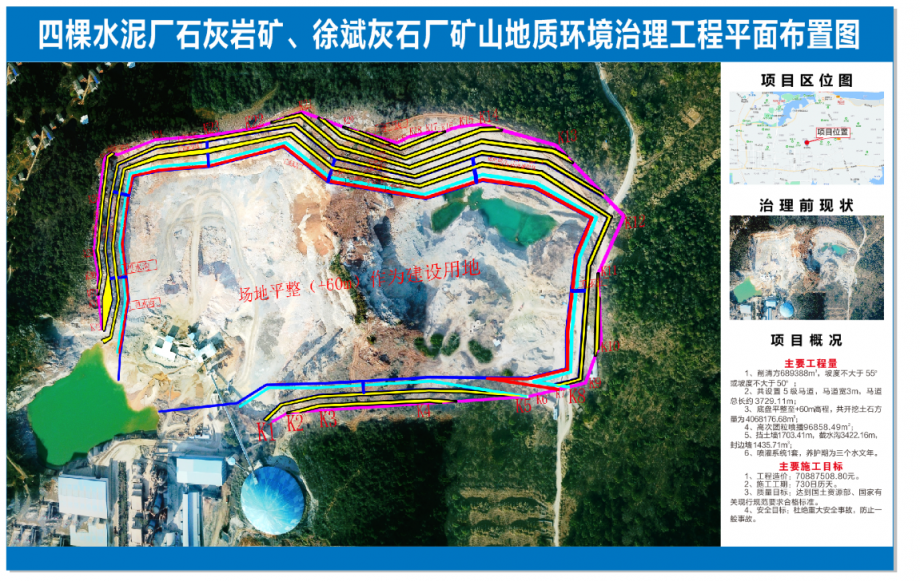 四棵水泥厂石灰岩矿、徐斌灰石厂矿山地质环境治理工程造价7088.75088万元,工期:730日历天,其中主要治理工程为:坡面削(清)方工程+场地平整+覆土绿化+高次团粒喷播绿化+封边墙绿化+挡土墙+地表排水工程+监测预警工程。竣工后形成场地直接对接江苏医药产业园,供其用于建立医药产业。