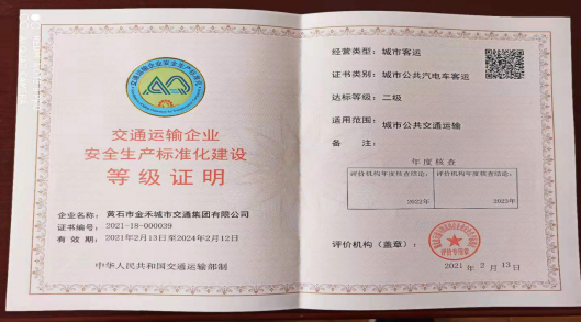 2021年新年伊始,湖北省运输与物流协会对黄石市金禾城市公交集团有限公司安全生产标准化15个方面的工作进行了实地考评。通过考评,金禾公司实现二级达标,荣获《交通运输企业安全生产标准化建设等级证明》。