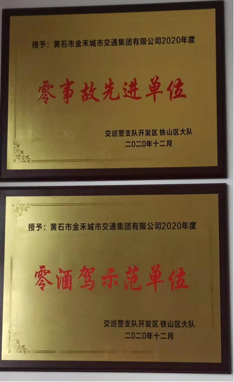 交巡警支队开发区 铁山区大队授予的2020年度零事故先进单位、零酒驾示范单位