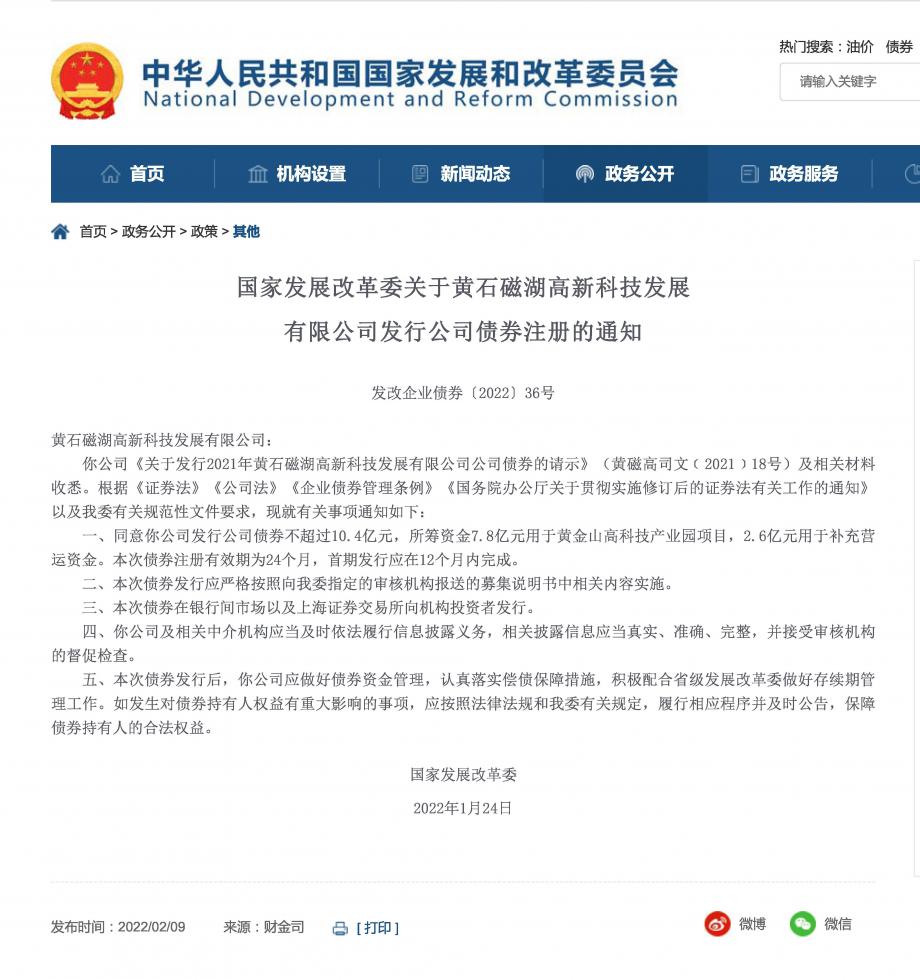 据国家发改委网站2月9日披露,“2021年黄石磁湖高新科技发展有限公司公司债券”已正式获批,发行金额不超过10.4亿元,募集资金将用于产业园区建设和营运资金补充。