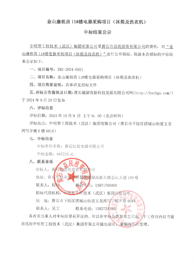 金山廉租房11#楼电器采购项目(冰箱及洗衣机)中标结果公示
