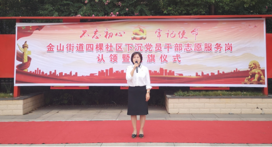 黄石高新物业公司董事长邹丹在社区下沉党员干部志愿服务岗认领暨授旗仪式上做动员讲话