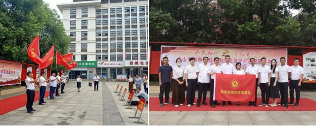 黄石高新物业公司董事长邹丹为社区科普宣教、助老助困等5支志愿服务队授旗并合影留念