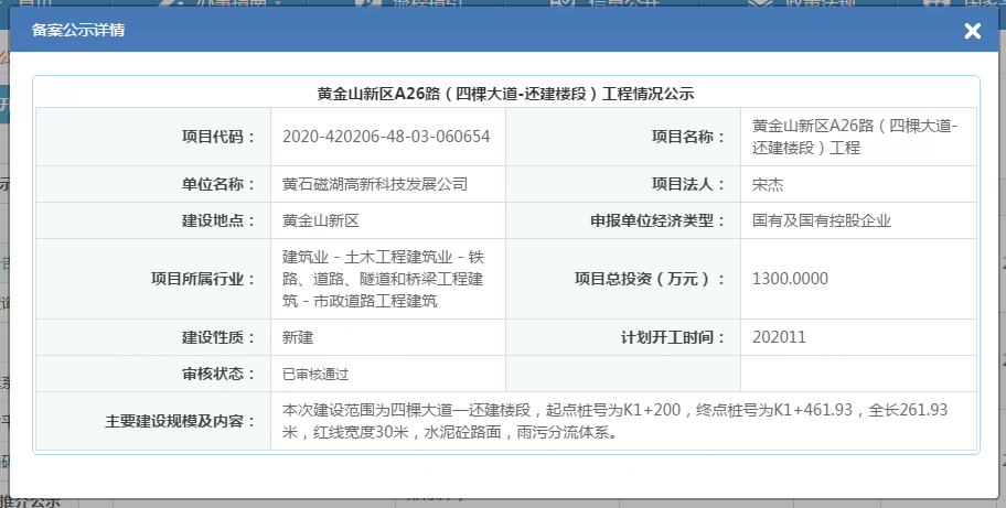 黄金山新区A26路(四棵大道-还建楼段)工程情况公示