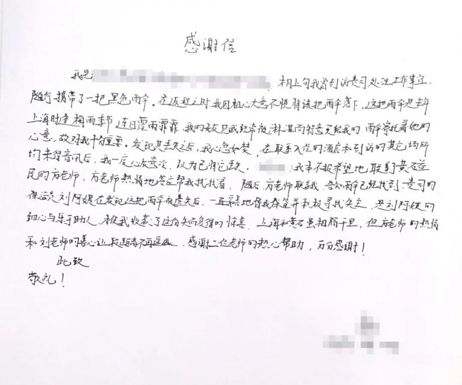 发现遗失贵重信物的李先生心急如焚,几经辗转,多方找寻,却都是无功而返……抱着最后的希望,李先生联系了近期到访的磁湖高新公司,公司融资专员方旭得知情况后迅速联系各方,帮助寻找。令人欣慰的是,物业保洁员刘爱心捡到了这把伞并妥善保管,也在四处寻找这一贵重物品的失主……“珍宝”失而复得,李先生十分感动,亲手写下了这封感谢信,并专程从上海寄来,以表感激之情。
