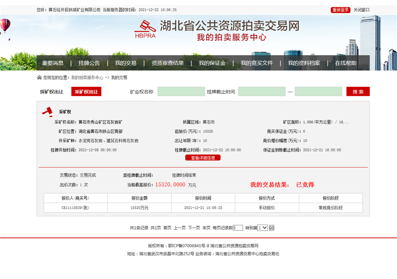 这是历史性的时刻!12月22日上午10时许,黄石经开投铁城矿业有限公司以15520万元的成交价竞得黄石市秀山矿区石灰岩矿采矿权,实现完美开局。