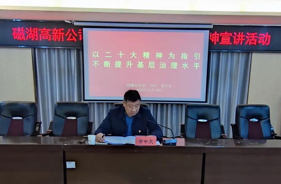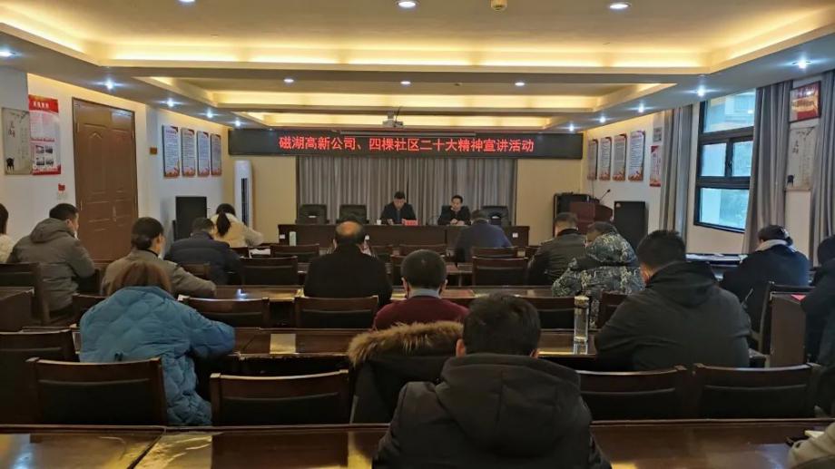11月30日,磁湖高新公司党委书记、董事长、四棵社区第一书记黄中天在社区宣讲党的二十大精神。四棵社区党支部书记吕绪权主持宣讲活动。公司及社区全体党员参加集中学习。